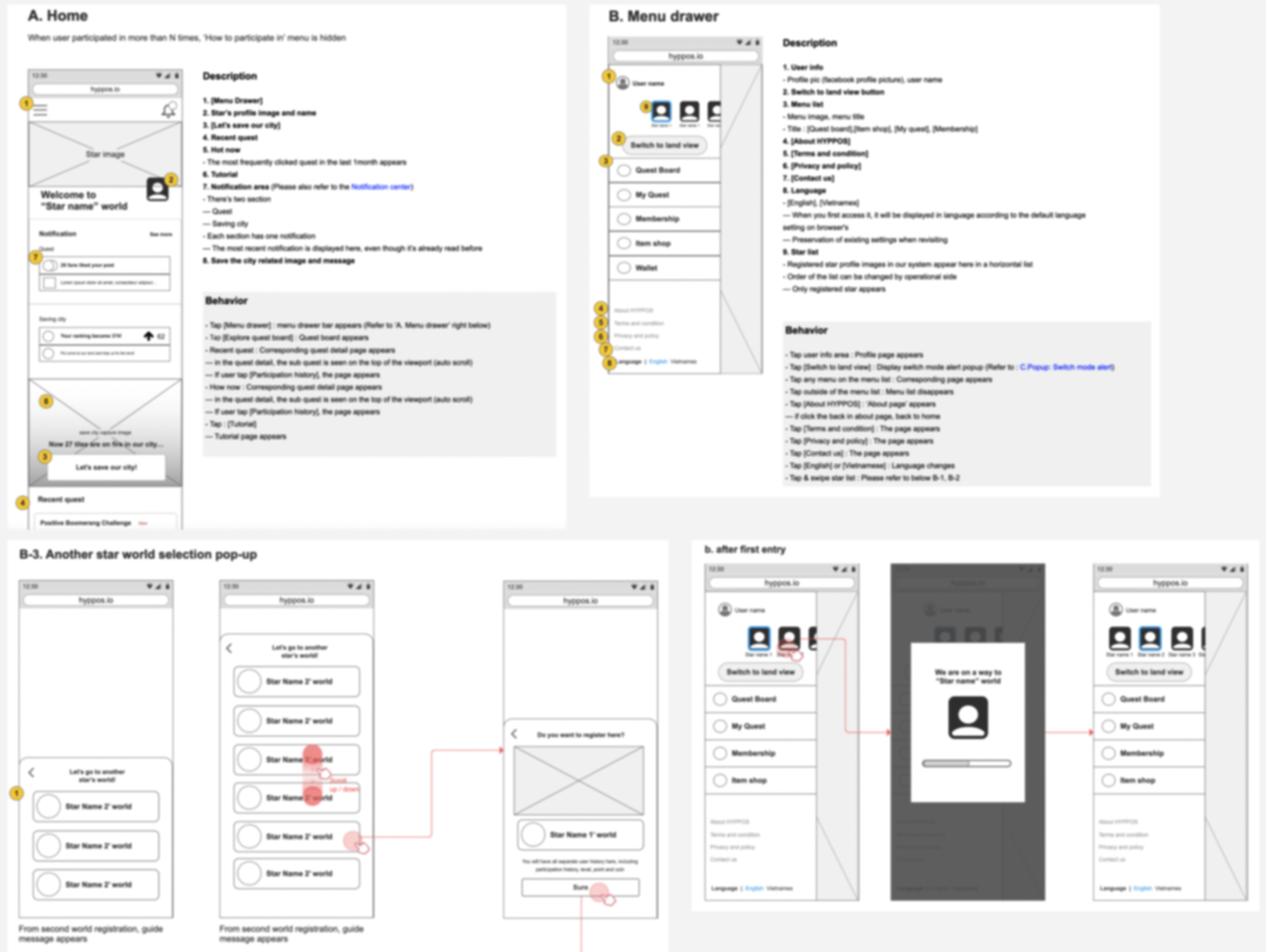 1) Wireframe: making flow, clear wireframes, and behavior specification, and