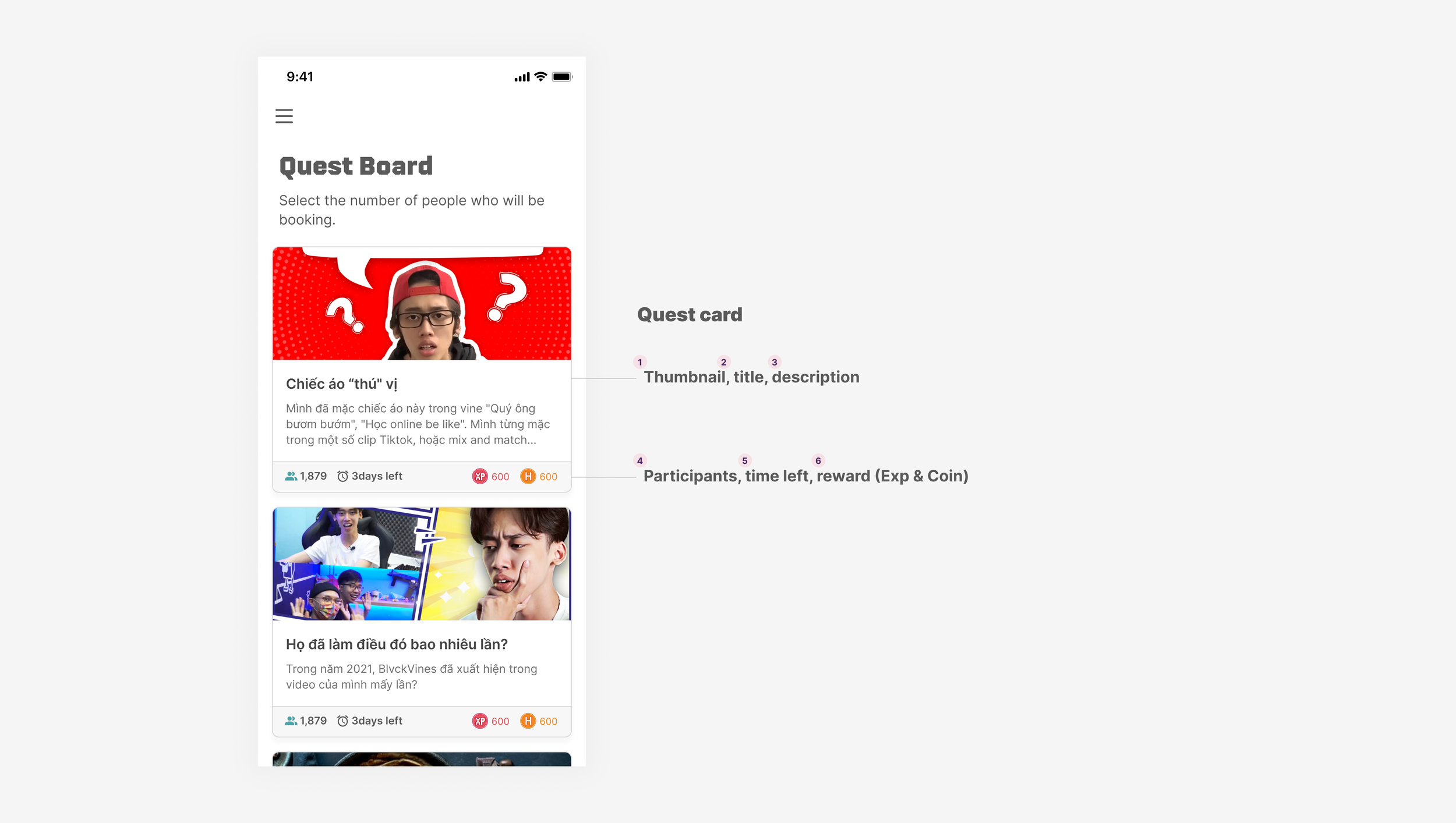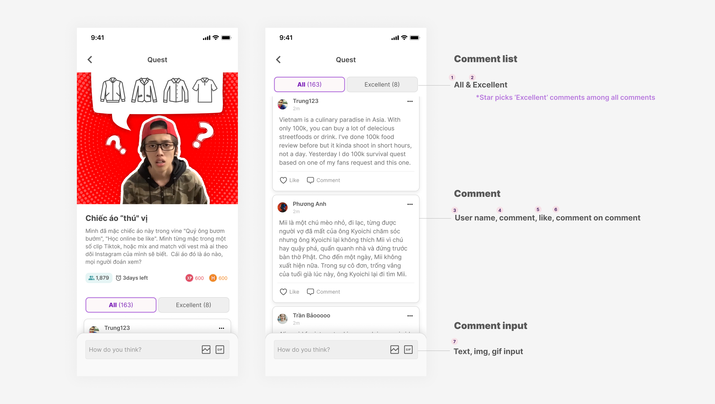 Users check what quest is uploaded from Creator, and participate in the quest by making a comment (which is kind of answer to the quest)