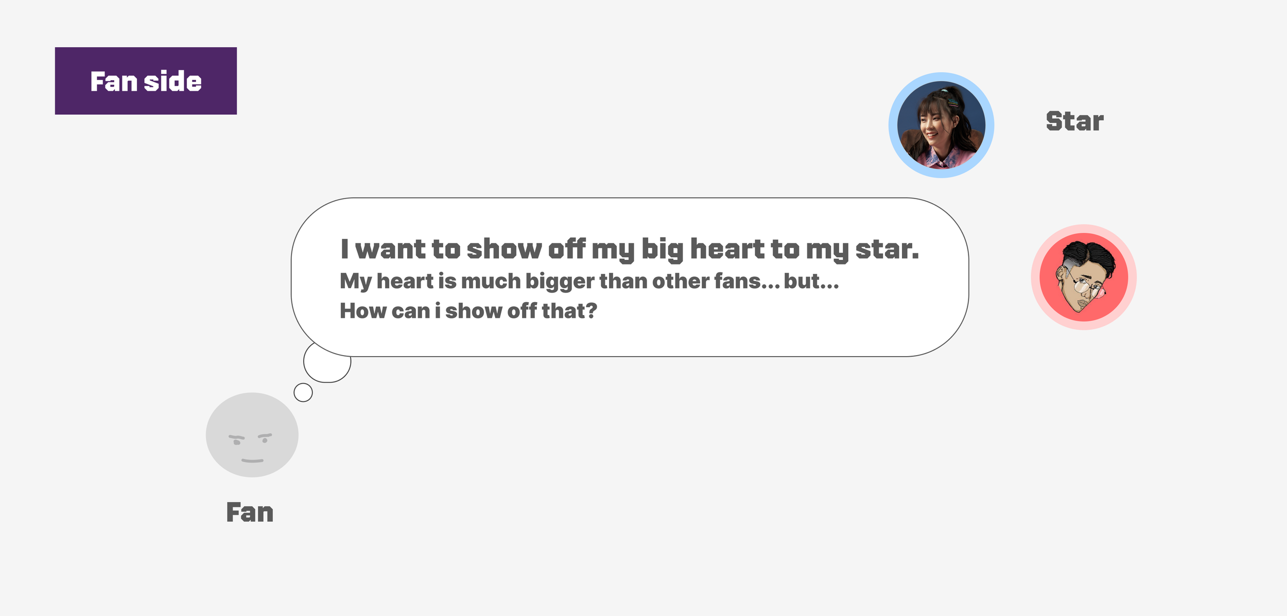 This platform fills the unmet needs of real passionate fans which Youtube can’t cover. Fans can reach their star easily in a more active way, and they can prove how much contribution they made to the star. By doing so, they can show off their big heart to the star. Star can reach their active and passionate fans, so they can manage the core fan group in a different and special way, so they keep the fan group more sticky, and stable. This online membership and community attracted 10,000 members within 3 months of beta service of 1 creator
