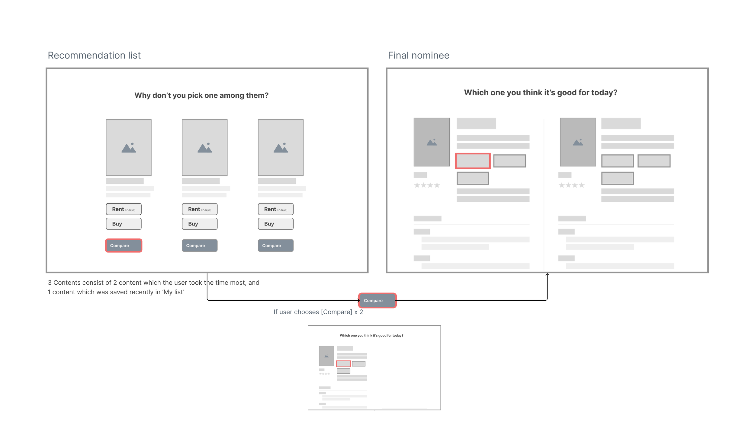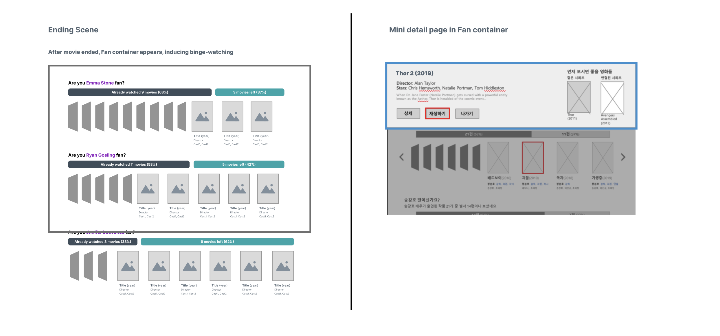 After a movie ended, fan list comes, so naturally induce a ‘Binge-watching’. If user selects a movie in the list, ‘Mini detail page’ appears instead of normal ‘full detail page’, so user feel less burden to check the detail page.