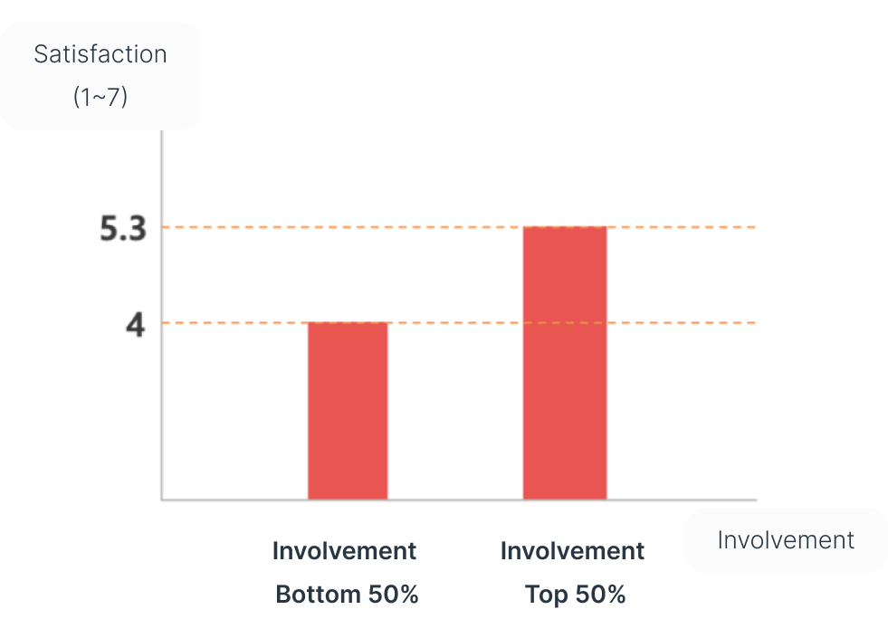 The top 50% involvement group showed 5.3 of satisfaction, while the bottom 50% group showed 4. It looks top 50% group people are satisfied, while the bottom group people felt neutral, not high but also not bad.