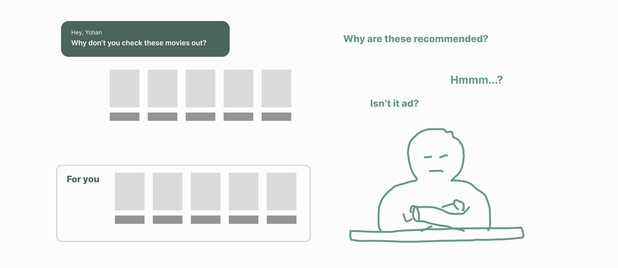Compared to this human communication, the current recommendation UX didn’t look persuasive at all. It is just suddenly throwing a bunch of recommendations without any reason. It doesn’t look valid or elaborated proposal at all. This sometimes makes me feel like, ‘How dare you give me a recommendation like this? isn’t it a random list?’ If it were human communication, giving a recommendation without a good reason can be even a bit rude.